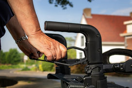 De ergonomische handvatten liggen prettig in de hand en ondersteunen een ontspannen loophouding. Ze zijn eenvoudig verstelbaar via klikstanden met duidelijke maatmarkering. Een slimme clip vergrendelt het handvat stevig en zorgt voor een spelingvrije, stabiele instelling. Zo geniet u bij elke wandeling van optimale controle en comfort.